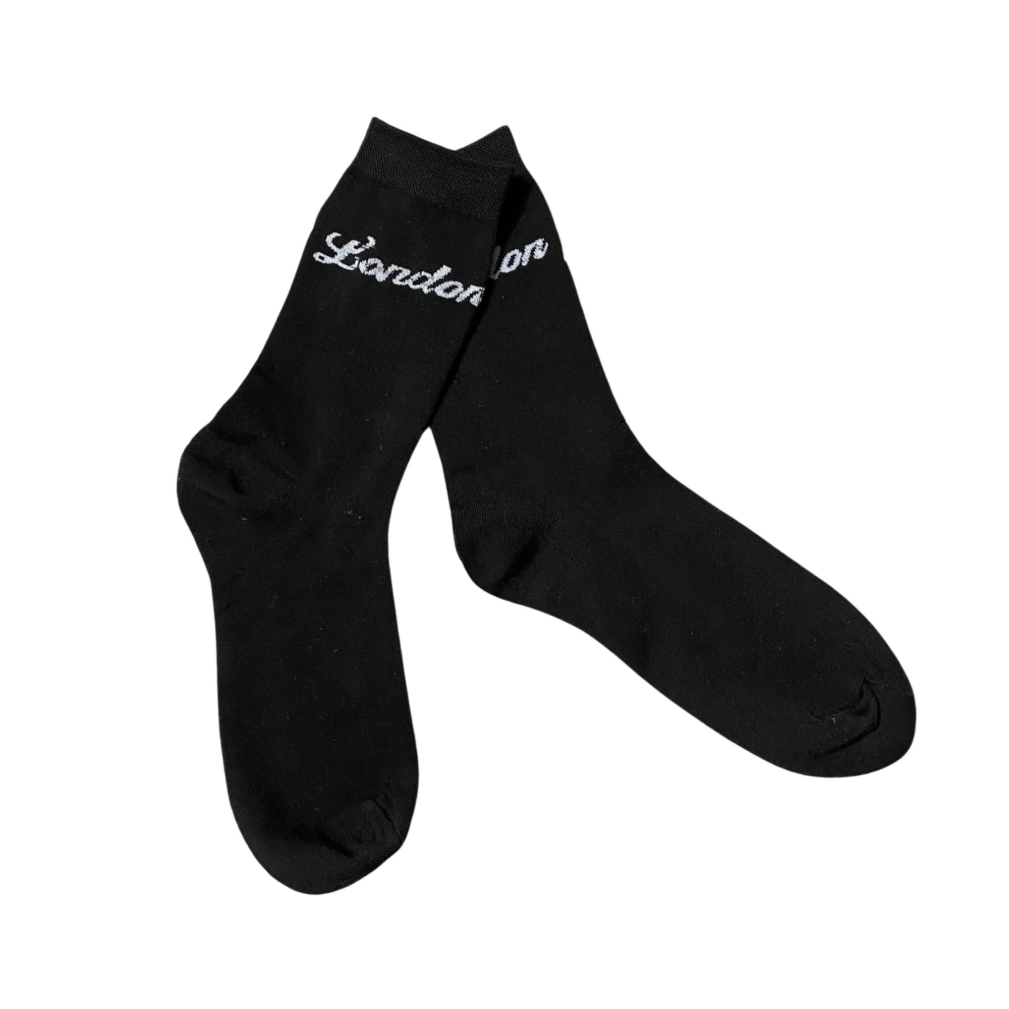 - jeden pár unisex černých ponožek s bílým nápisem London kolem kotníku