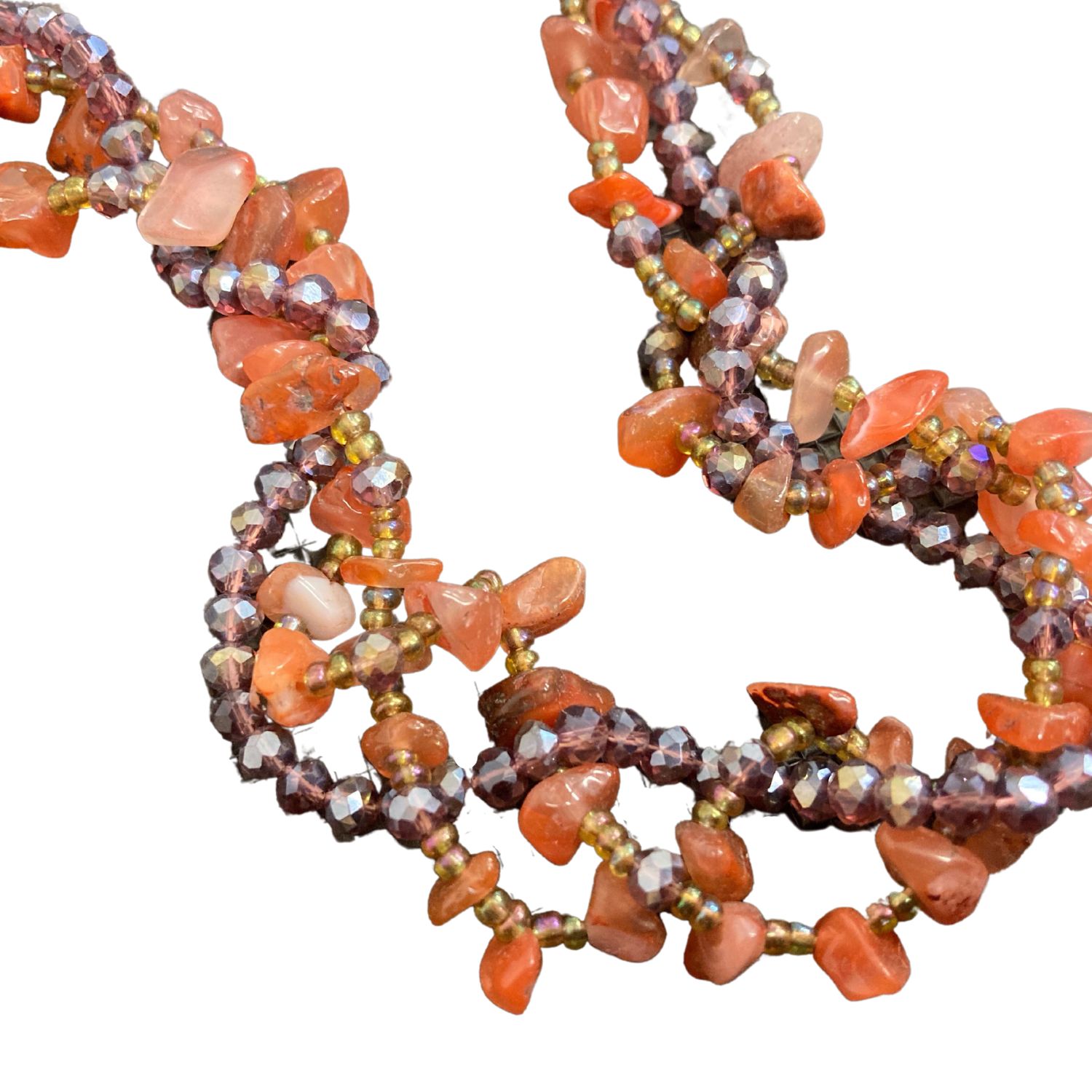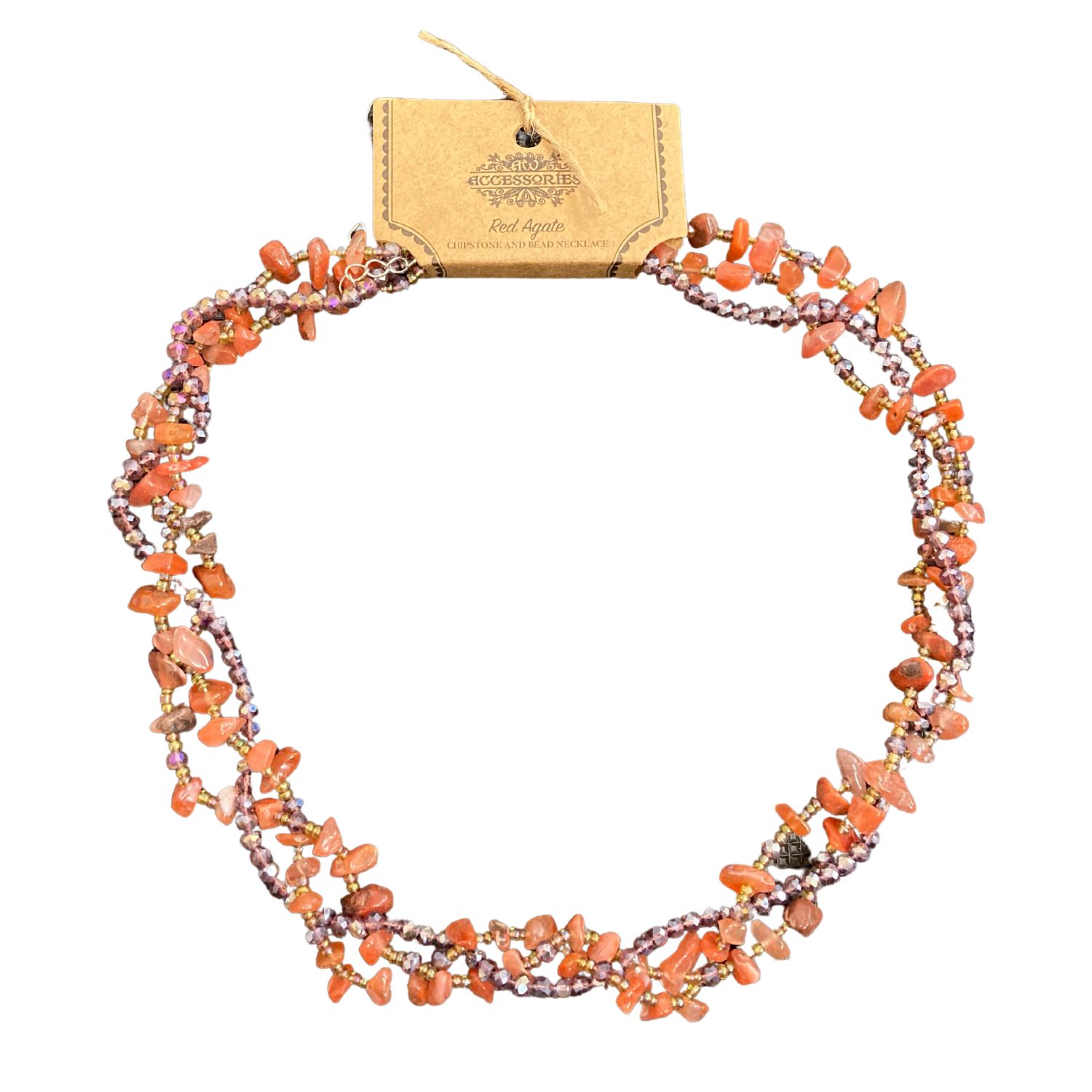 Je vyroben z pečlivě vybraných kamínků červeného achátu a korálků fialové a zlaté barvy.